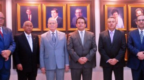 Miembros de la Junta Directiva de CADOAR. Desde la izquierda, J. Osiris Mota (Vocal), Nelson H. Hernández (Tesorero), Héctor Corominas Peña (Vicesecretario), Moisés Franco Llenas (2do. Vicepresidente), Carlos Ramón Romero (Presidente), Luis Gutiérrez (Vocal), Simón Mahfoud M. (Secretario), y Miguel Villamán (Presidente Ejecutivo).