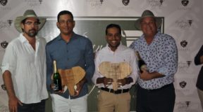 Cesar Rodriguez y Wascar Jorge, ganadores del mejor score gross overall reciben su trofeos de Efrem García y Ricardo Hazoury