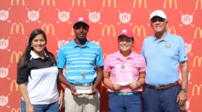 Desde la izquierda Gabriela Nouel, coordinadora de mercadeo de McDonald’s, premia a Nicolás Caimari y Stephany Kim, ganadores de la cuarta parada del Tour Juvenil de Fedogolf. Figura Rafael Villalona, presidente de Fedogolf, último desde la izquierda.