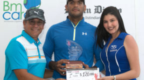 Gilbert Paul Cruz, campeón del Snead Flight, recibe su trofeo de Felix Olivo, Director del Golf Channel AM Tour RD, en la 5ta. Parada celebrada en La Cana.