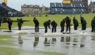 Partes del hoyo 18 estaban tan anegadas que equipos de operarios tuvieron que barrer el agua, que les cubría los robillos, al Burn Swilcan.